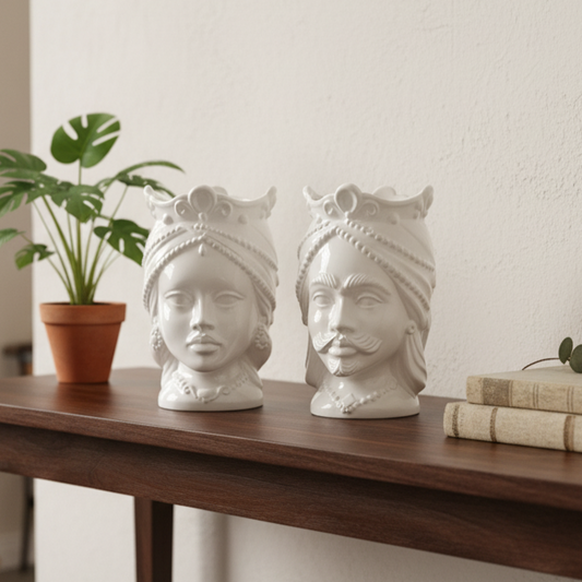 Pair of White Moor's Heads - Various Size- in sicilian ceramic from Caltagirone