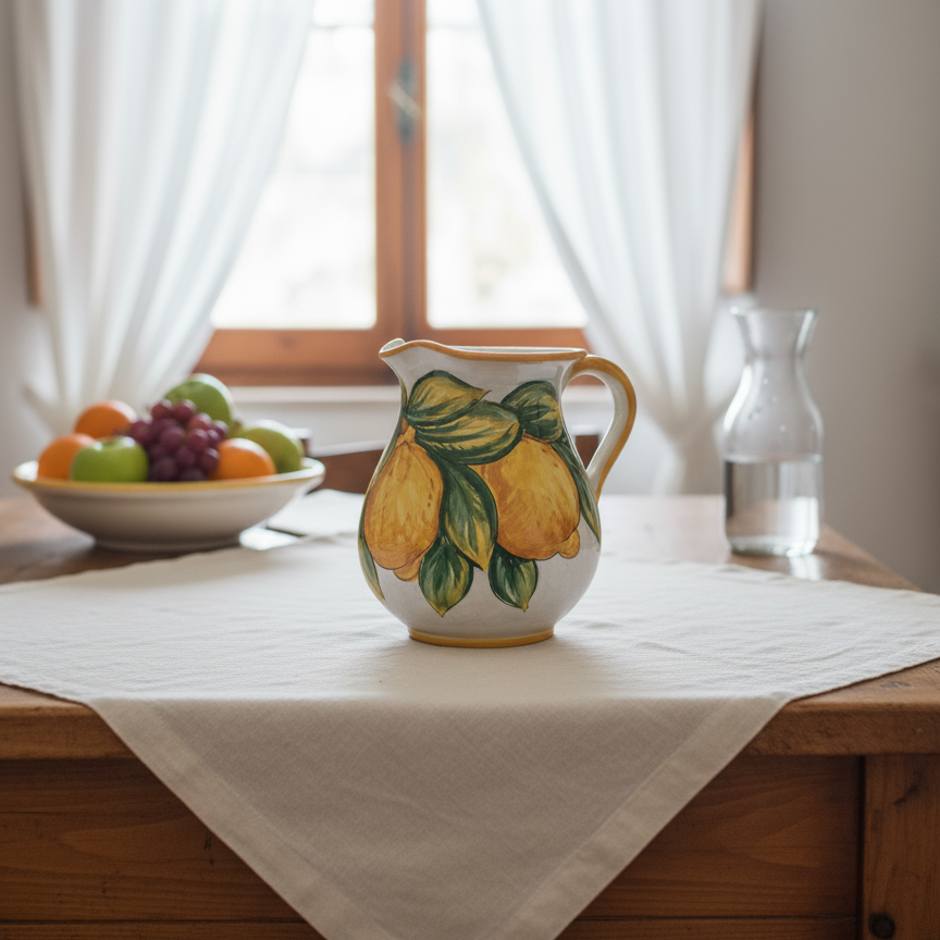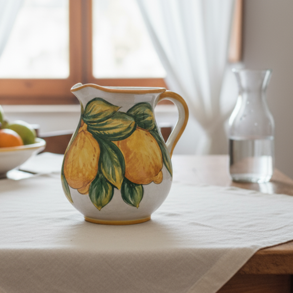 Caraffa realizzata in ceramica artistica siciliana da maestri artigiani di Sicilia. Ideale per acqua o vino è perfetta per colorare la tavola. Il decoro limoni è fatto interamente a mano per questo ogni pezzo sarà unico.