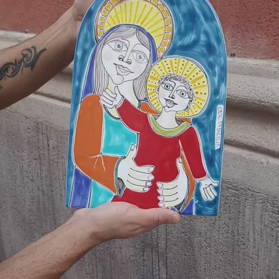 Rendete la vostra casa ancora più accogliente con questa meravigliosa piastra in Maiolica di Sicilia raffigurante ''Madonna con Bambino''. Realizzato a mano da esperti artigiani, questo pezzo unico porta in sé la bellezza e l'arte della tradizione siciliana riletta in chiave moderna. Perfetto per qualsiasi ambiente o come elemento decorativo nella vostra camera da letto, questo quadro è un vero capolavoro da collezionare o regalare.