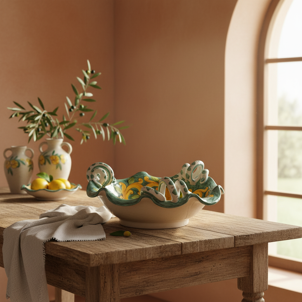 Centrotavola con Manici Ricciolo 32cm in Maiolica Siciliana di Santo Stefano di Camastra