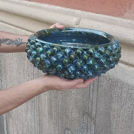 Originale centro tavola pigna in ceramica siciliana fatto a mano da maestri artigiani. Il centrotavola è arricchito dai pinoli della pigna che nella tradizione siciliana viene regalata per augurare prosperità fortuna e abbondanza. Utilizzabile come porta frutta o svuota tasche. La tecnica di decoro con colori sfumati fa si che il centrotavola sia unico.