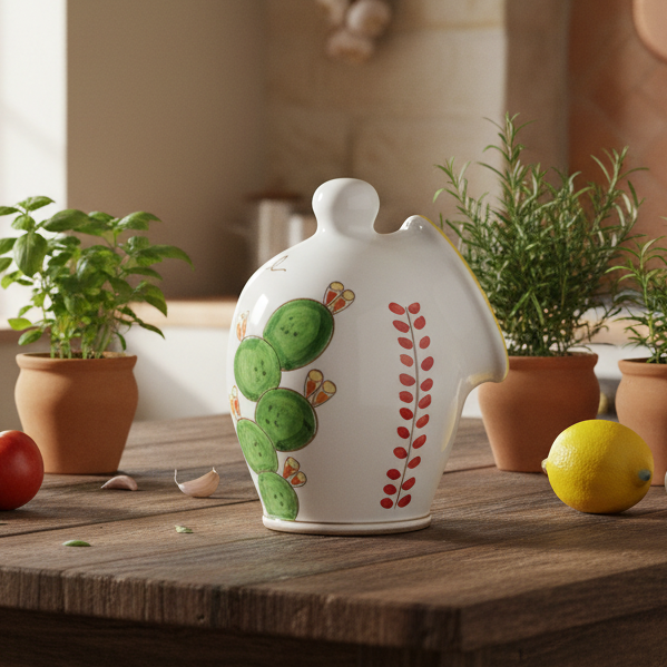 Questo oggetto è unico nel suo genere. E' un contenitore per il sale che ha un'apertura frontale, bocca di leone, che non prevede tappo cosi da facilitare la presa del sale stesso. Veniva utilizzato anticamente nelle tonnare dove si produceva pesce sotto sale. Oggi viene usato anche come contenitore per le cialde o capsule del caffè. E' realizzato interamente a mano con un decoro che si rifà al fico d'india, pianta molto diffusa sull'isola.