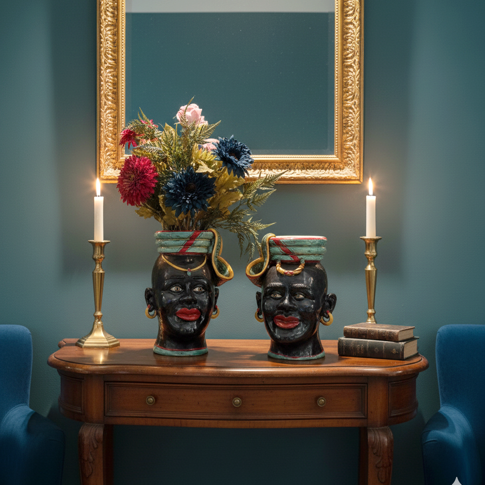 Teste di Moro in ceramica artistica di Caltagirone dal design unico e accattivante per la loro originalità. Sono delle teste antropomorfe che si ispirano e re-interpretano le famose Teste di Moro. Pezzi unici da collezionare.