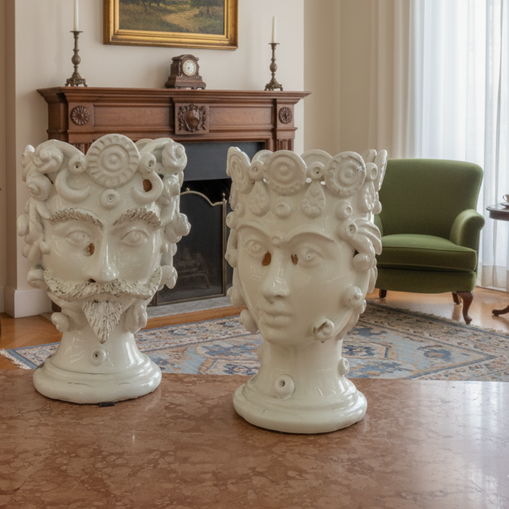 Teste di Moro design Sikani bianco crema realizzate e modellate interamente a mano da maestri artigiani di Sicilia. Il tipo di prodotto è stato prodotto con la procedura terzo fuoco in modo da realizzare sfumature di bianco irregolare sul volto e ghirigori.